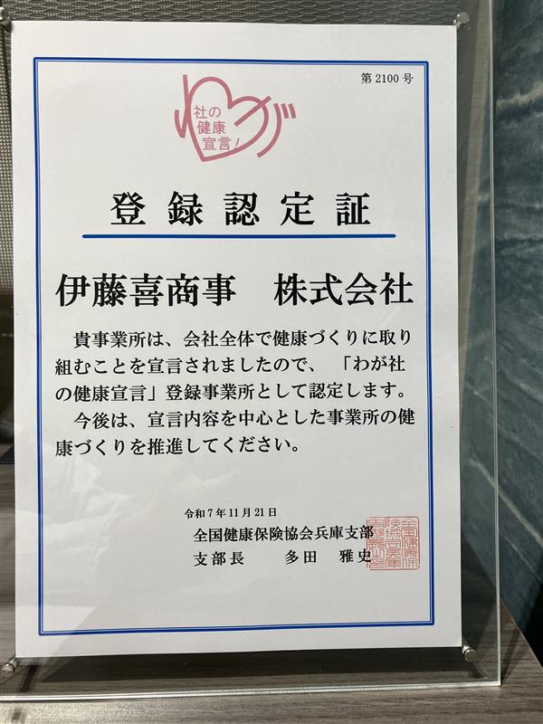 『健康宣言』― 従業員の心と体の健康を企業全体で推進 ―伊藤喜商事はこのたび、従業員の健康づくりに本気で取り組むことを表明する「健康宣言」を行いました。
