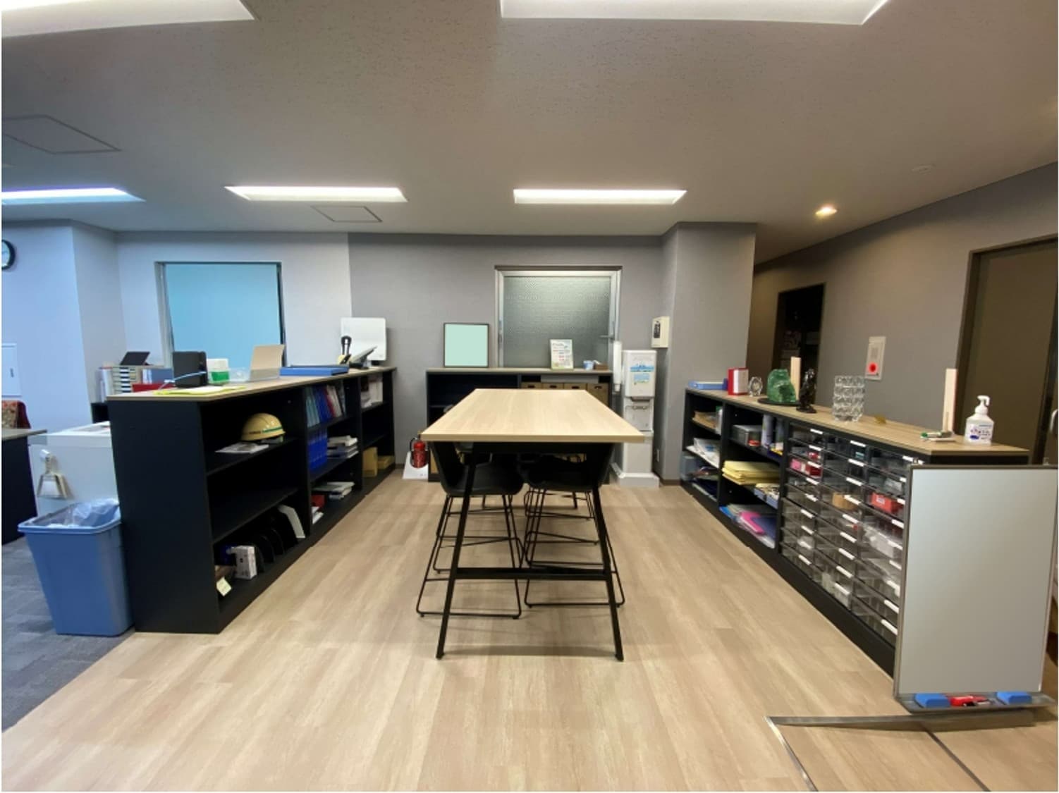 これまでは3階にしかなかったミーティングスペースを今回のリニューアル工事で、2階3階ともにオープンミーティングスペース兼共有物品の収納コーナーとして新たに設けました。