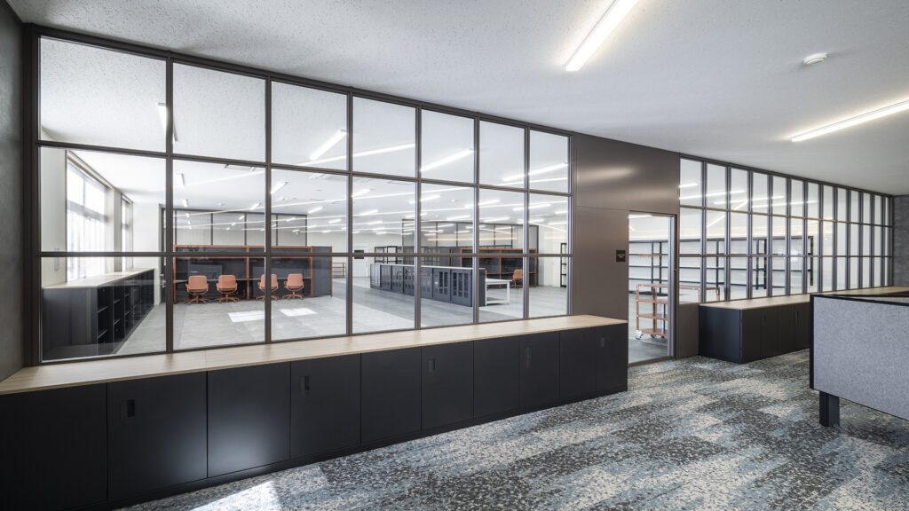 ガラスの出入り口は隣のコミュニケーションラウンジを超え、奥のオフィスを貫通するアプローチデザイン
